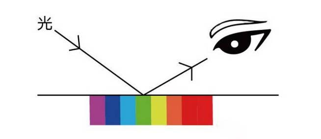当光波投射在物体身上后,该物质会传送、吸收或反射不同部分的光波。根据不同物体的特性以及它本身的原子构造,它可能反射了绿光但吸收了其它的波长。这时候人们的视网膜和脑部视觉皮质区会处理此一反射光,然后形成我们所看到的颜色。 全部反射时,看到的就是白色;全部吸收时,看到的就是黑色。