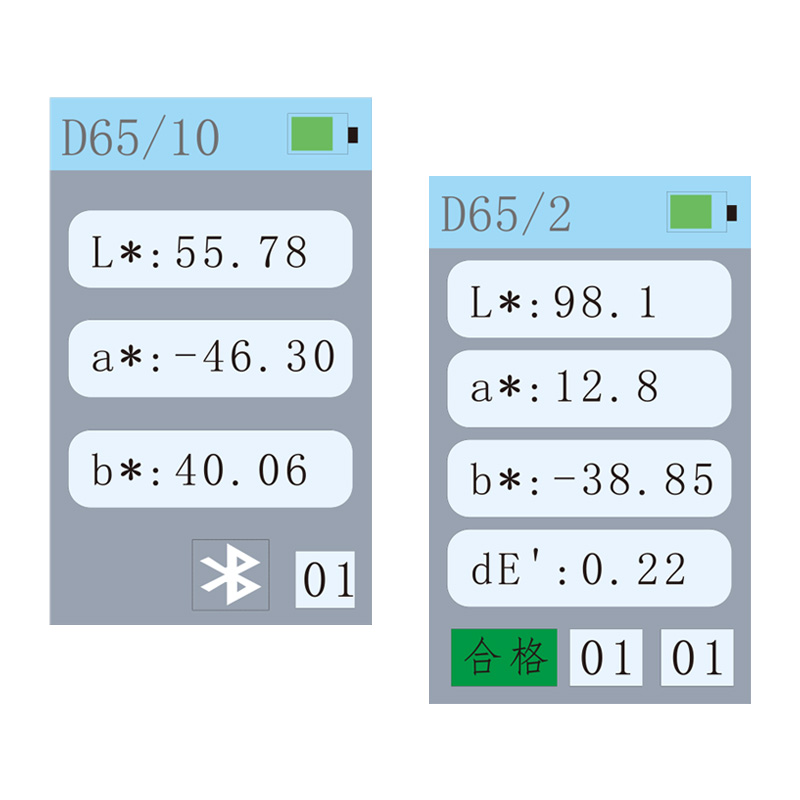 | 显示 | 样品色度值,色差值/图,合格/不合格结果,颜色仿真,颜色偏向,反射率(部分通过手机APP实现) | ||