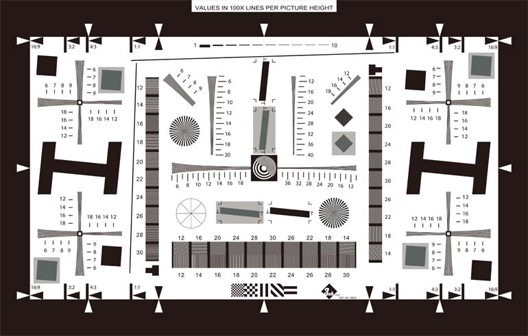 解析度卡(分辨率卡)是标准样张,可以提供实际拍摄的垂直分辨率和水平分辨率等辅助测试。 分辨率测试采用了国际标准的ISO12233解析度分辨率卡进行测试,采取统一拍摄角度和拍摄环境, 而分辩率的计算又使用了HYRes软件,分开垂直分辨率和水平分辨率两部分进行。